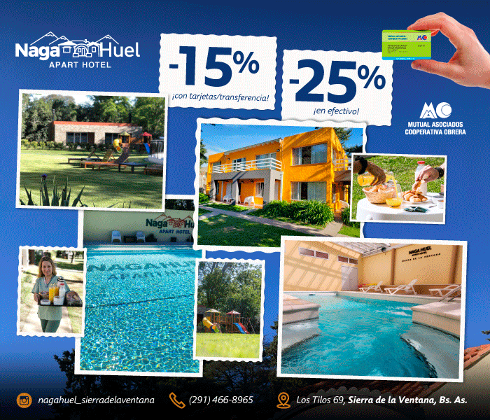 Apart Hotel en Sierra de la Ventana ubicada en el partido de Tornquist, - Provincia de Buenos Aires, brindará a los asociados de la Mutual un -15% de descuento con Tarjeta de credito en 1 pago/Debito o Transferencia Bancaria y un -25% de descuento en Efectivo