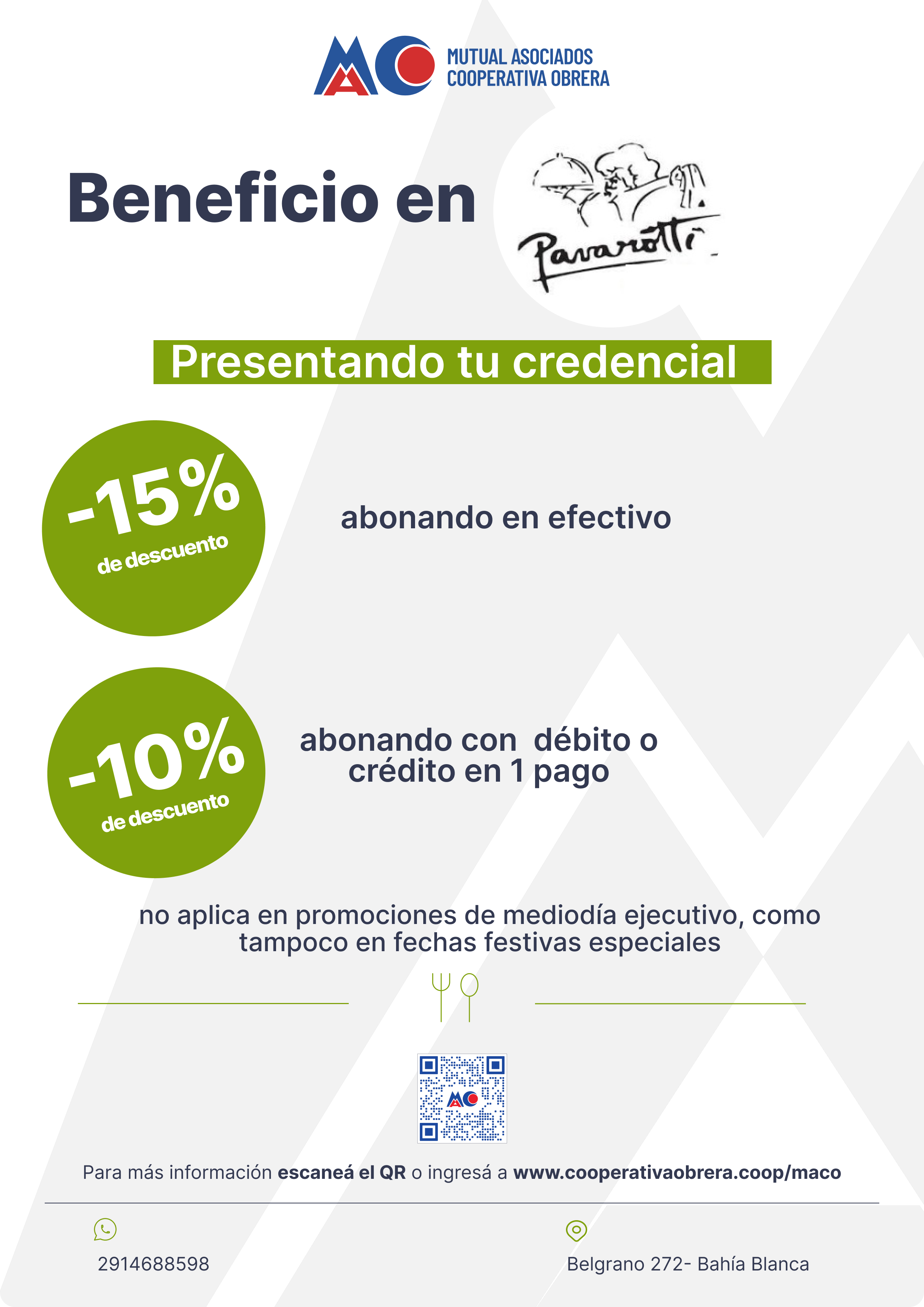 El descuento es acumulativo a los beneficios que se encuentran vigentes en Pavarotti, para consumos “a la carta y carta de promociones”; no aplicable en las promociones de mediodía ejecutivo, como tampoco en fechas festivas (Día de los Enamorados, Día de Padre, Día del Amigo, Día de la Madre, Nochebuena y Fin de Año.)