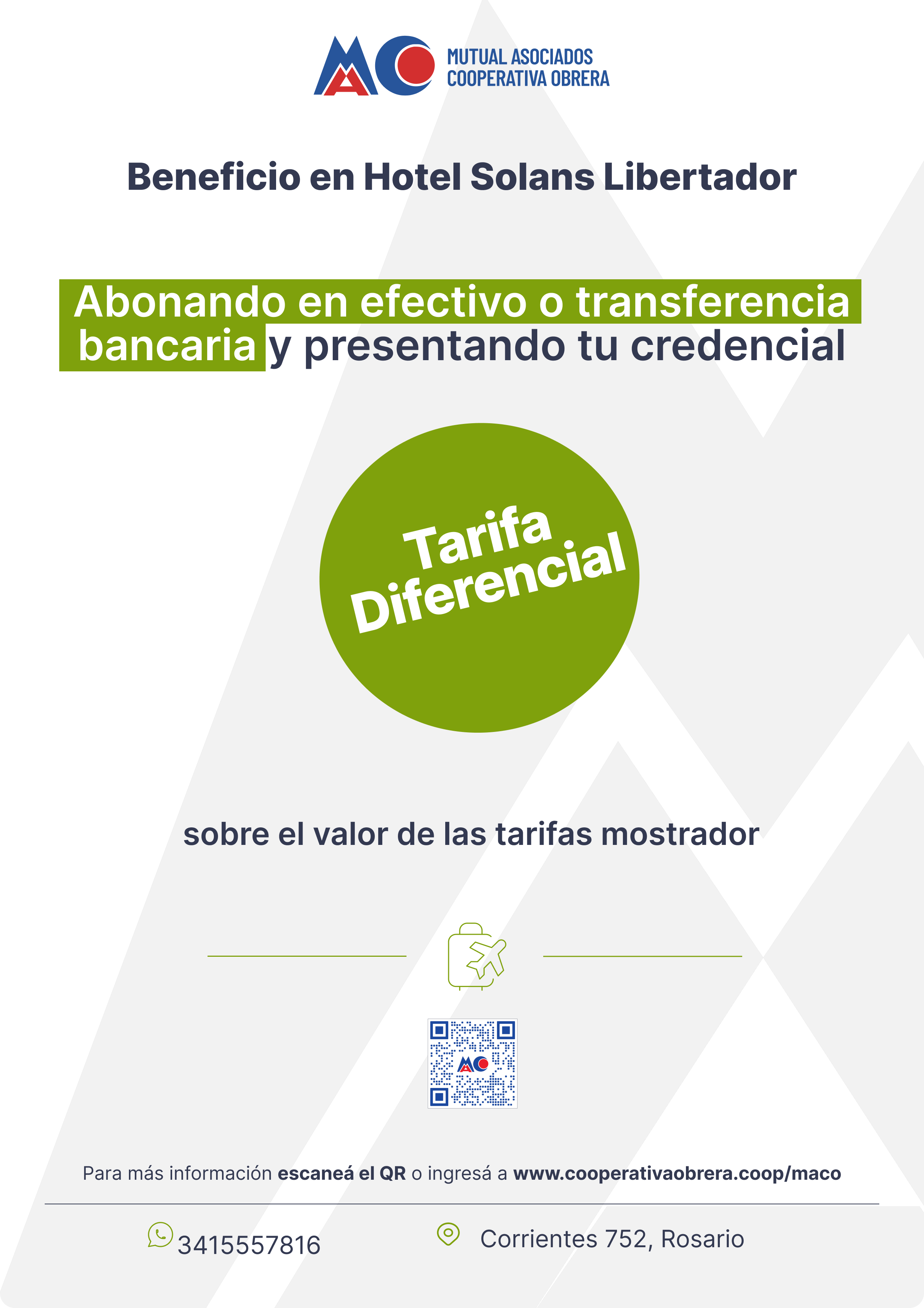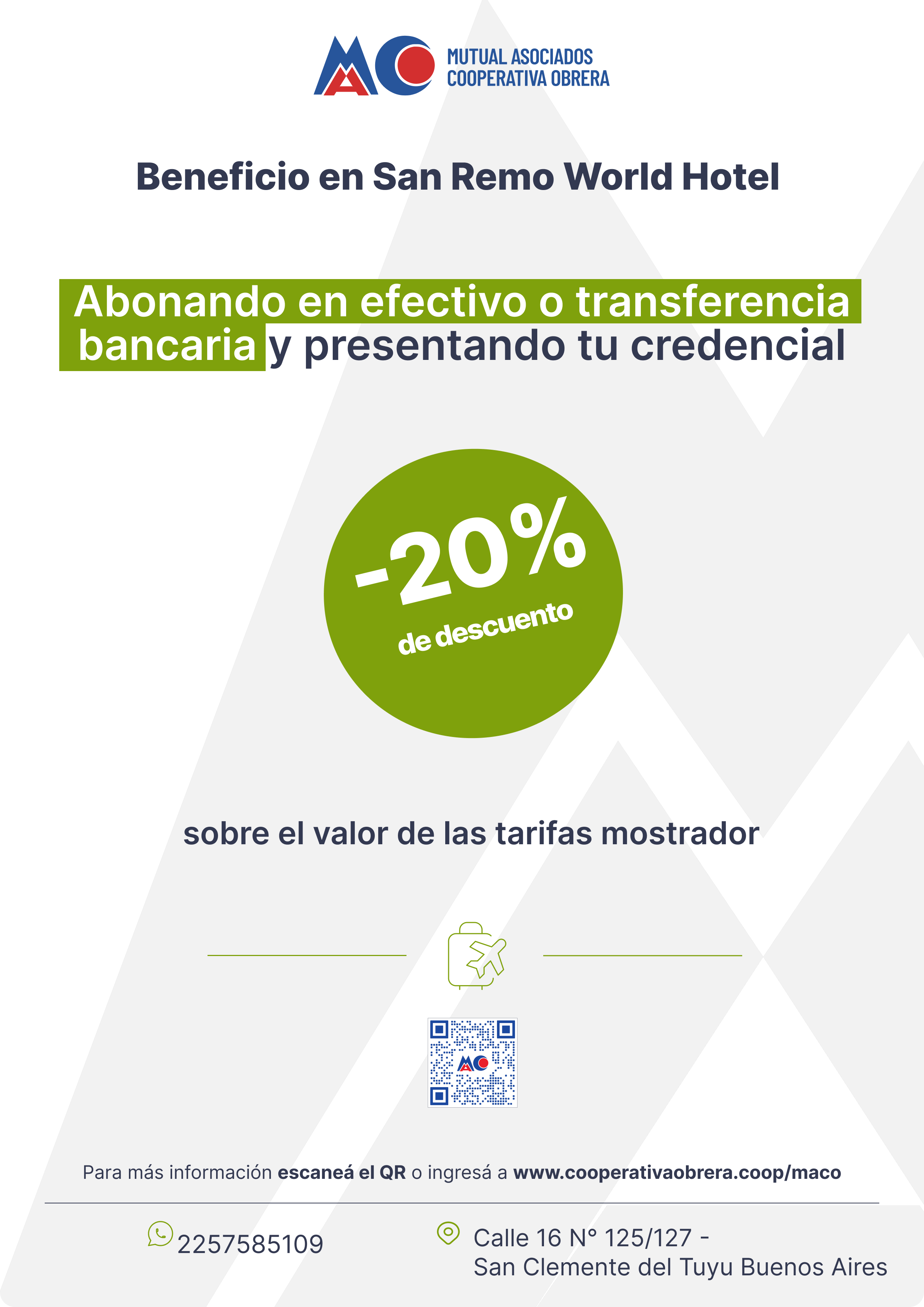 El beneficiario para poder obtener su descuento, deberá presentar y acreditar en el hotel, su condición de integrante de la Mutual Asociados Cooperativa Obrera con la credencial identificatoria que posee.
