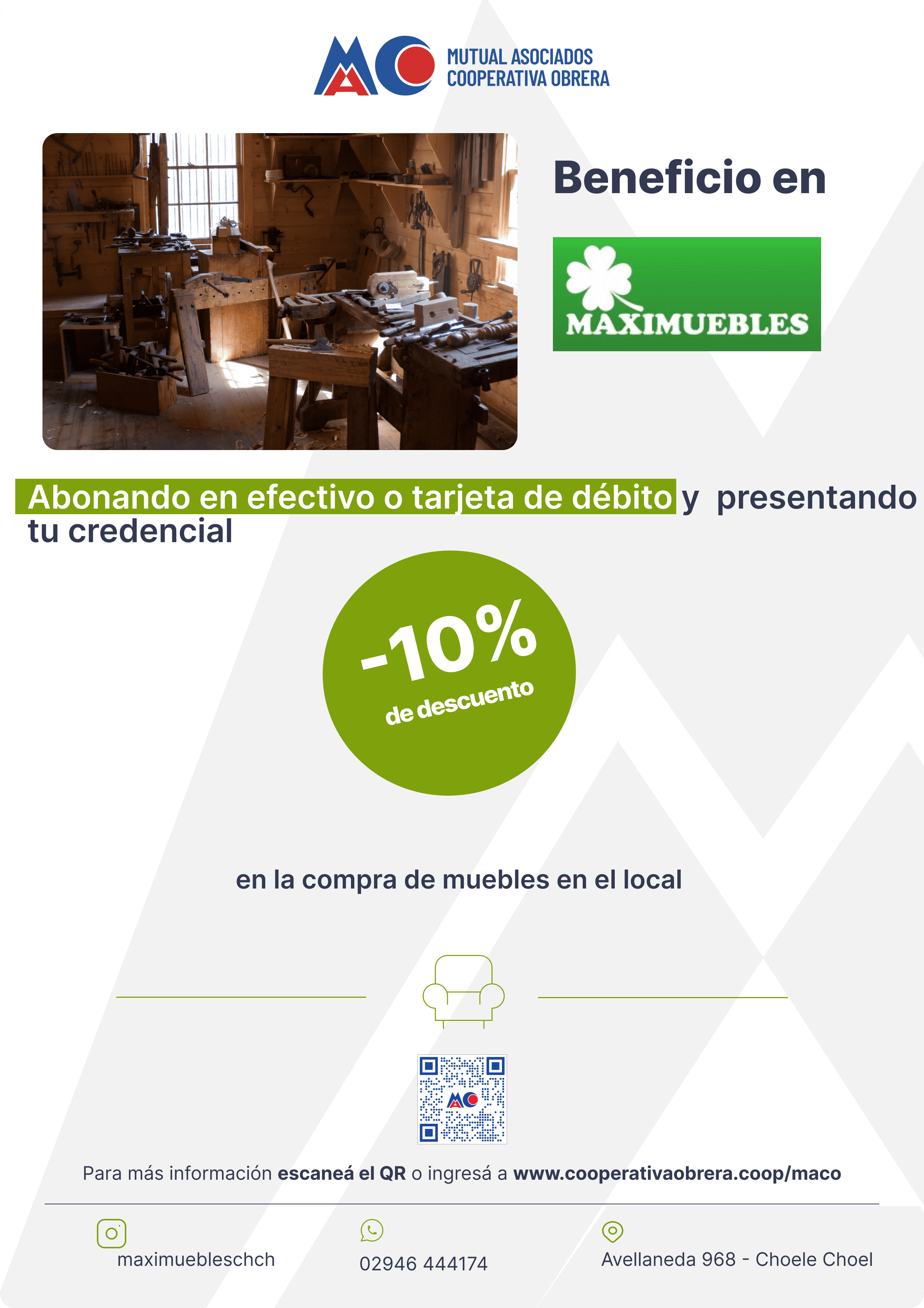 MaxiMuebles ofrece a todos los asociados de la Mutual, un 10% de descuento en la compra de muebles en su local