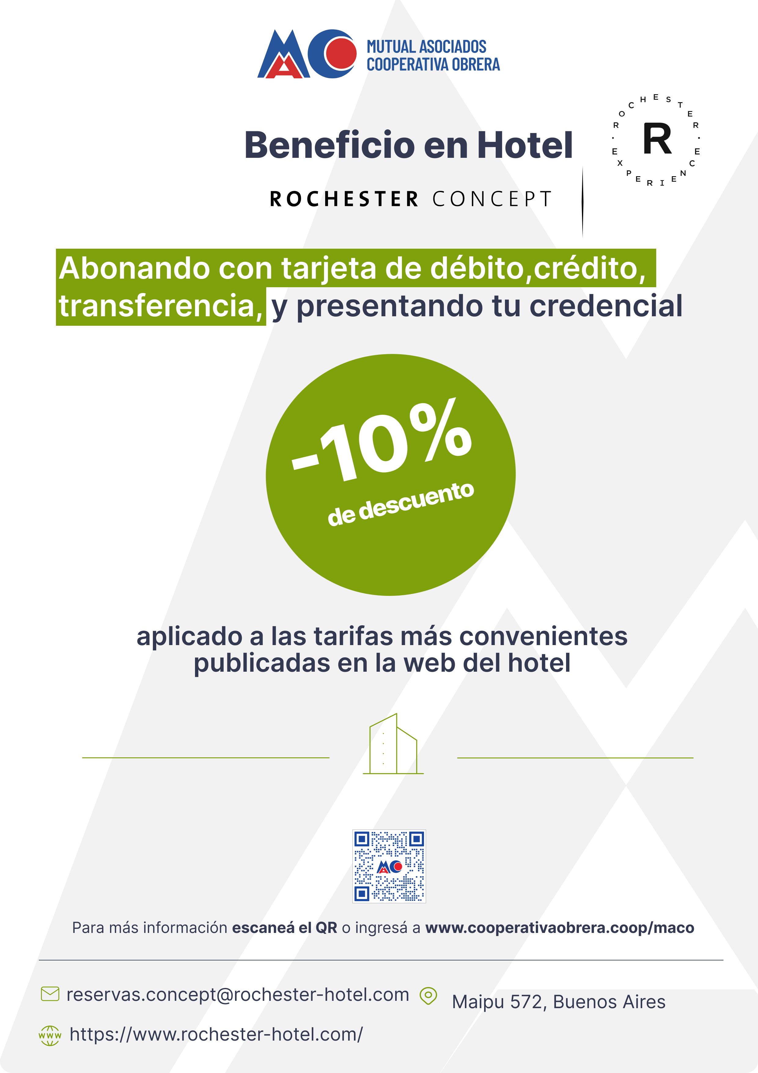 Las reservas deberán ser realizadas a la dirección de email reservas.concept@rochester-hotel.com ó llamando al +5411 5032 5565