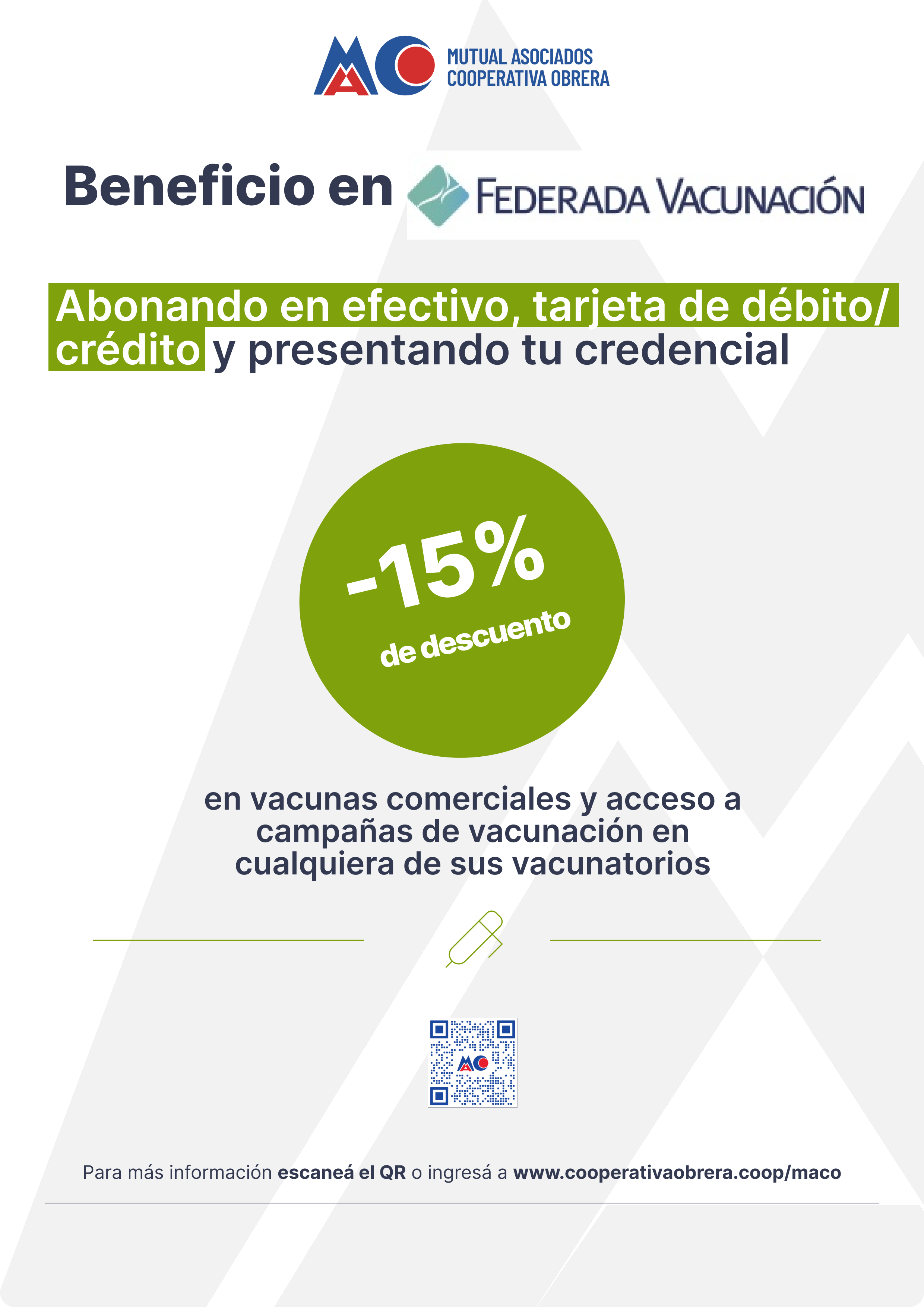 FEDERADA VACUNACIÓN, brinda a todos los asociados de la Mutual, acceso sin costo a vacunas incluidas en calendario nacional de vacunación, hasta el 15% de descuento en vacunas comerciales y acceso a campañas de vacunación en cualquiera de sus vacunatorios y los que en el futuro se inauguren, con la presentación de la Credencial identificatoria de asociado MACO
